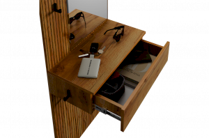Крючки предоставляют удобное место для хранения сумок или аксессуаров. Выкатной ящик служит дополнительным пространством для хранения мелочей, таких как ключи, кошелек, косметика или другие небольшие предметы.