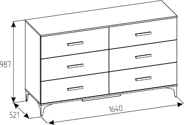 Широкий вместительный комод с шестью ящиками – функциональный модуль, который подходит не только для хранения вещей, но и для размещения телевизора. Столешница и основание комода подчеркнуты контрастным декором Дуб Табачный. Фигурные металлические опоры и ручки из массива органично дополняют модуль.