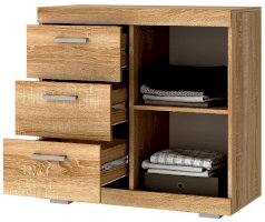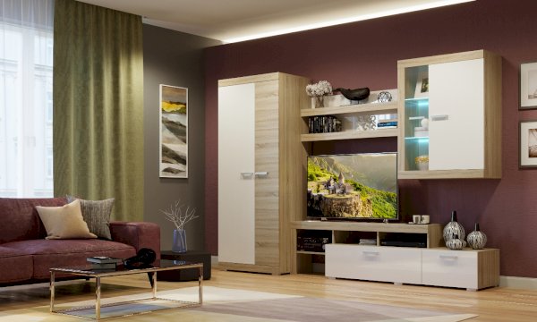 В гостиной Соната применяются современные европейские декоры: корпус выполнен из ЛДСП Дуб сонома, фасад из ЛДСП Белый глянец. Декоры отличаются выраженной тёплой древесной текстурой, а фасадная часть подчёркнута горизонтальными линиями текстуры и стильными планками МДФ, представляющими собой элементы корпуса и фасада.