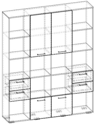 Применение задней стенки из ЛДСП (в ячейках с ящиками и фасадами) позволяет использовать данный стеллаж для зонирования пространства (чтобы предотвратить опрокидывание, необходимо обеспечить крепление стеллажа к стене).