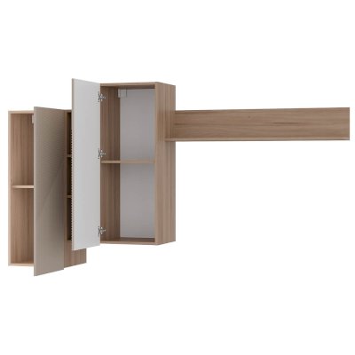 Гостиный модуль "Эмилия" ГМ-12 включает в себя ассиметричные шкафчики и длинную стильную рейку, что придает дизайну коллекции индивидуальность. В шкафчиках находится по две вместительных полки, а между ними расположены открытые узкие полки, которые идеально подойдут для хранения сувениров и элементов декора.