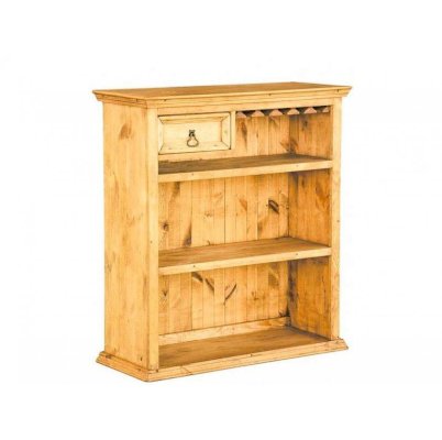 Невысокая барная стойка для дома. Две встроенные полки без дверей разместят все необходимые атрибуты. В верхней части стойки расположены встроенный выдвижной ящик для различных мелочей и kit-бар для подвески бокалов. Задняя стенка, как и весь корпус, выполнена из массива сосны. Изделие поставляется в собранном виде. Небольшие габариты делают библио бар мобильным элементом мебели и отличным аксессуаром как шумной дружеской вечеринки, так и романтического свидания.